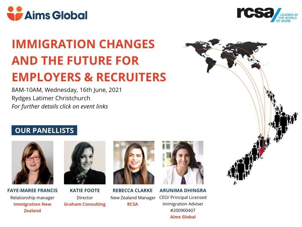 Aims Global in association with RCSA (Recruitment, Consulting and Staffing Association Australia & New Zealand) invite you to join them for a panel discussion on 'Immigration changes and the future for Employers & Recruiters' in Christchurch.